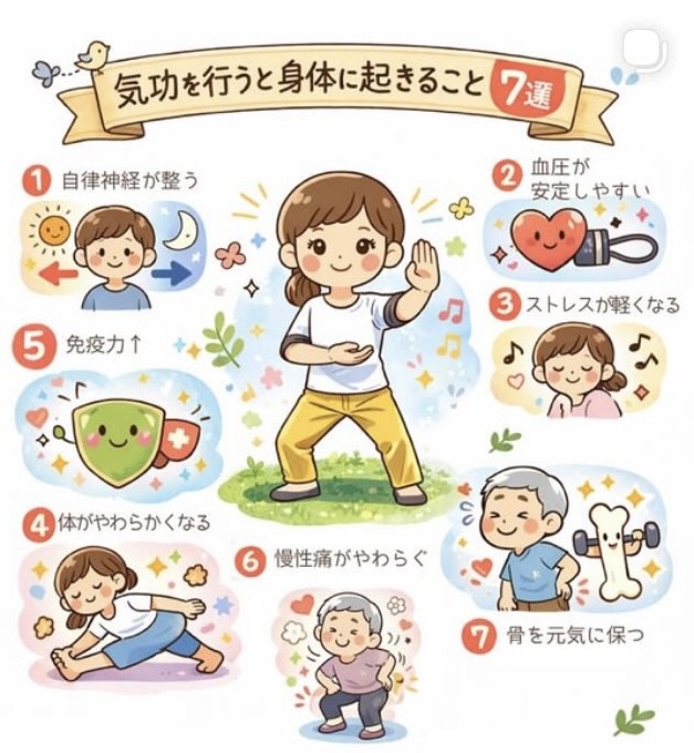 曲にのせて、全身のエネルギーをまわし、内気を感じ、うちに充電する気功です。